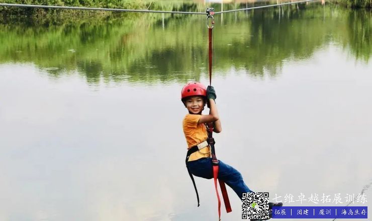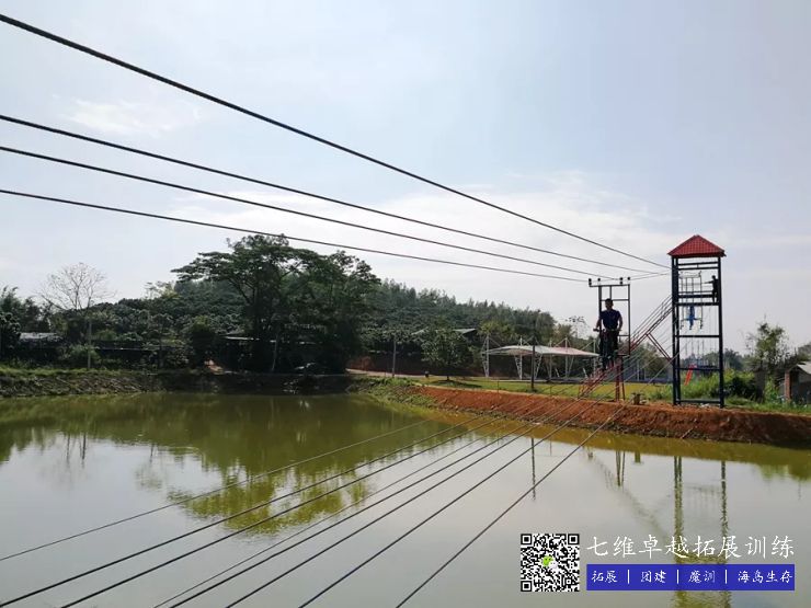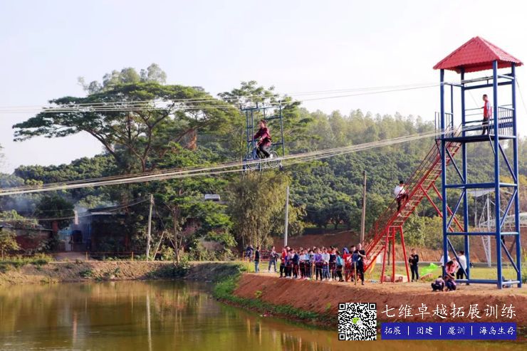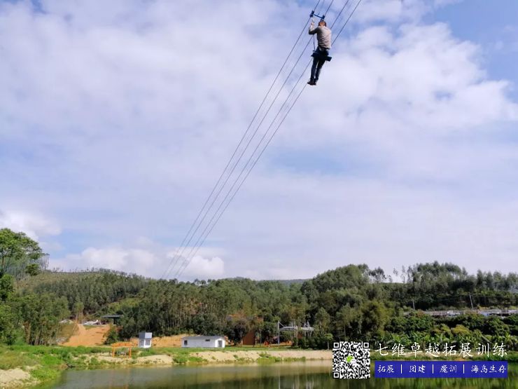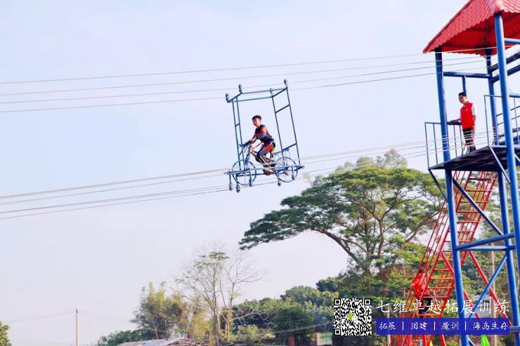 空中单车——十米高台,钢索横跨百米水域,人与单车的重力在钢索之上利用自然落差的惯性,以极快的速度“飞”向对岸,具有一定的挑战性。