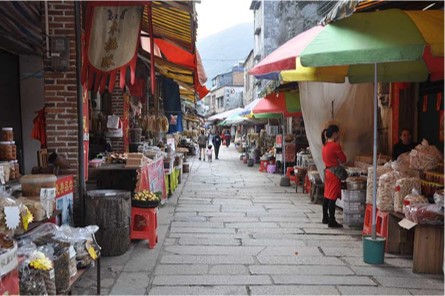 石巷相传有几百年历史,地上保留着青砖石坂,一代路人游历已磨去了岁月。这里的村民自营山华李、蘑菇、蜂蜜、菜干等集中在这条石巷上,还有一声声售卖的叫唤“豆腐花”。