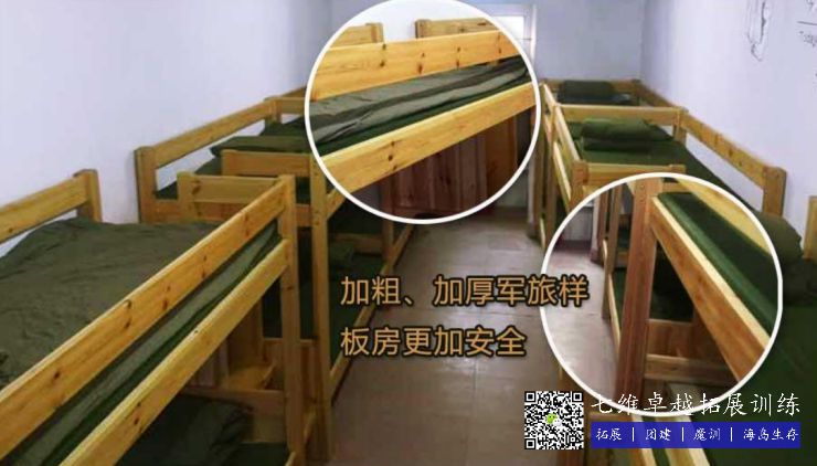 军旅样板房坐落在拓展基地内,周边环境清幽,可同时容纳200人同时入场,是体验团体生活的首选。