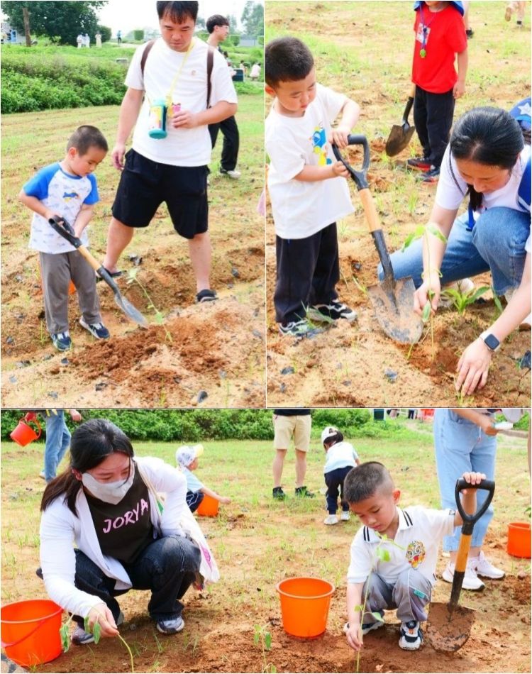 在家长的陪伴和鼓励下,孩子们拿起锄头和向日葵苗,瞬间变身为农夫。种苗、培土、浇水,每一道程序,孩子们都在认真地进行着
