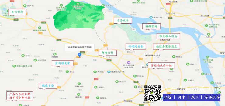 龙船花谷拓展训练基地座落于江门市鹤山龙口镇龙船花谷,占地面积约730亩,现已建有皮划艇、定向越野、射箭、高尔夫球、攻防箭、平衡车等水陆空户外特色项目;还在自然生态、国防科工营区开辟了60亩田地、种植区、科普区、学习及科技创新活动场所;同时餐饮、住宿、舞台、会议配套设施已有序落地,是珠三角露营地旅游的首选。