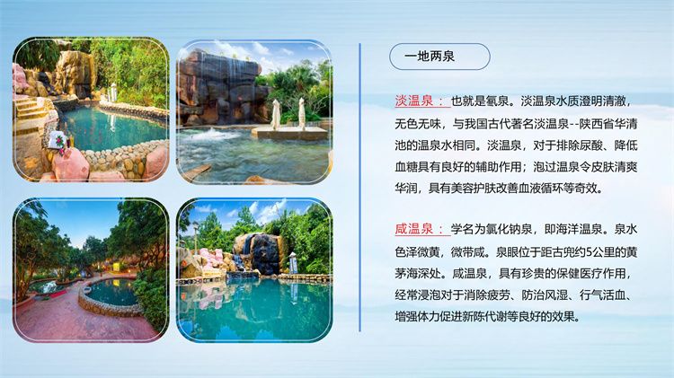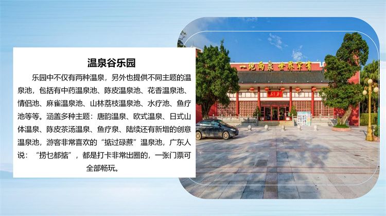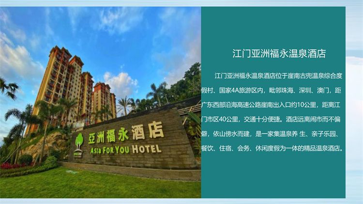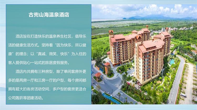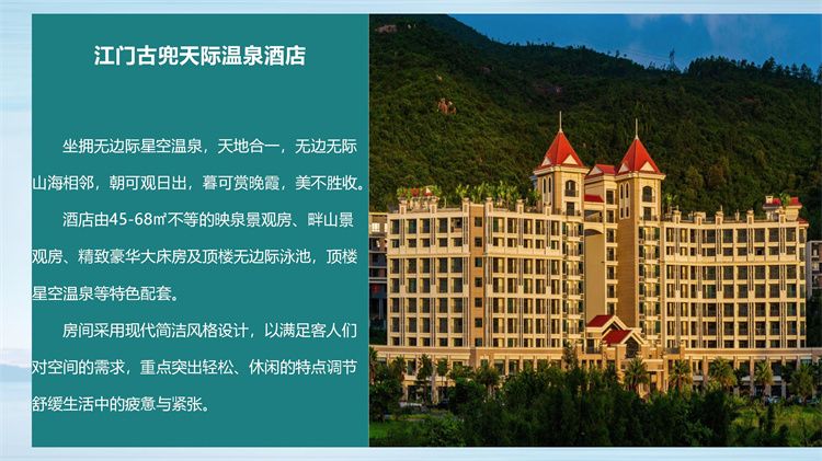 古兜温泉度假区是国家AAAA级旅游景区,中国五星温泉,坐落于古兜山下,占地面积3000多亩。古兜温泉度假区主要功能有:六大主题酒店、六大旅游配套设施和各种商业综合配套,是一个集山、海、湖、泉自然风光、温泉养生、康体娱乐、美食购物、商务会议、企业团建、拓展培训于一体的四季旅游度假胜地。