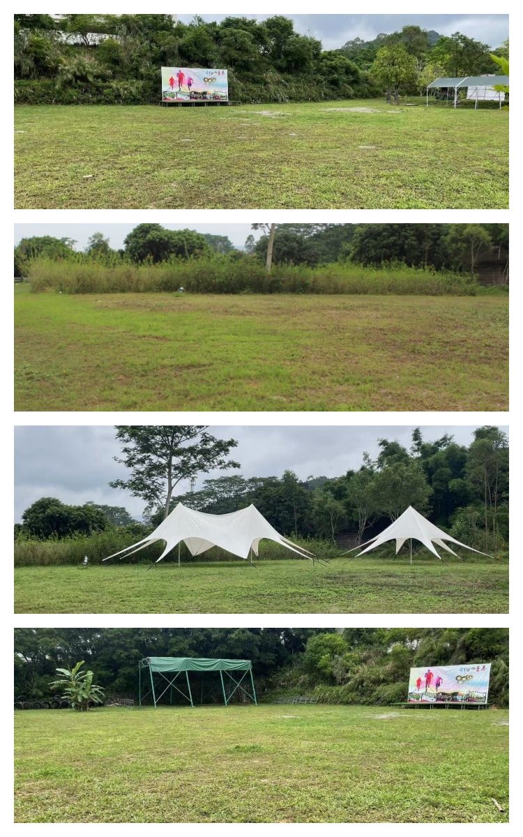 营地有大小草地,共四个区域:A区达1500平方,B区C区达800平方;D区400平方,另外有篮球场,空地室内课室,风雨棚供不同团队同时使用。