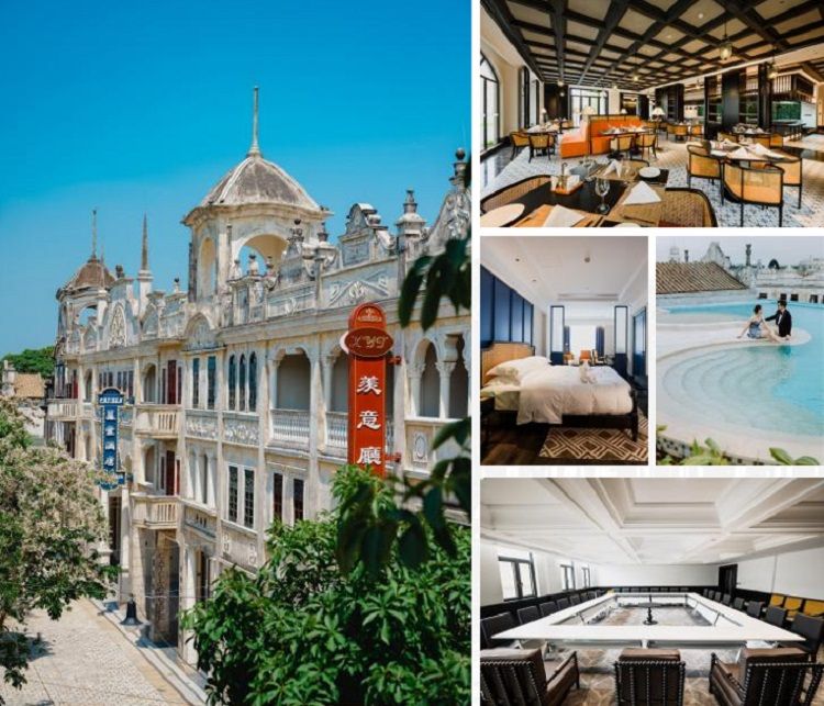 该酒店位于关氏家族与司徒氏家族的交界处 , 占 地面积9234㎡ ,拥有108间客房 ,分为1号楼和2 号楼 , 配备临河大堂吧、 空中露台泳池、 会议室, 紧邻婚礼堂 , 让您在入住期间穿越民国 , 追忆昔 日英雄气概。