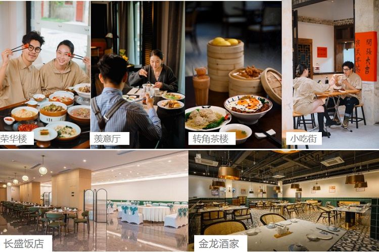 早茶客、长盛饭店、美堂羡意厅、 南圜餐厅、金龙酒家、老石炉披萨 店、荣华楼、威灵顿咖啡厅、花神 西饼屋、新记奶茶店、转角茶楼、 枫里堂凉茶铺、