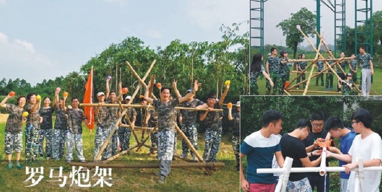 在我们的拓展项目中,队员要在规定的时间内搭建好炮台,用装满水的皮球代替石头,攻击对方队员,项目得分高的一方为胜。