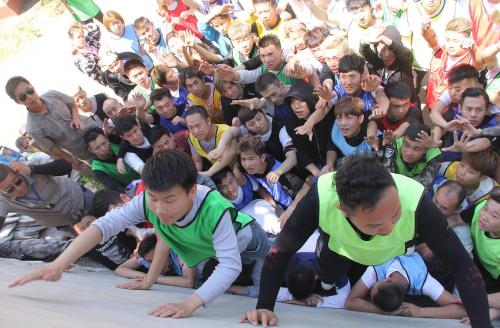 面对任务大家开始讨论怎么去做,搭人墙的是最容易想到的方法。墙上有人拉,下面有学员做支撑,其他人就比较容易上去。但是培训师还给另外一条规定,已经爬上去的学员不可以再当人梯。有两个很关键的问题:第一个和最后一个学员怎么爬上去??