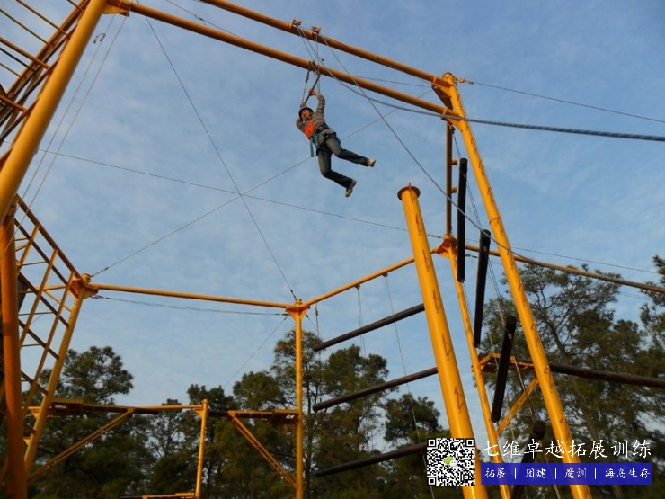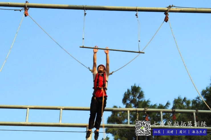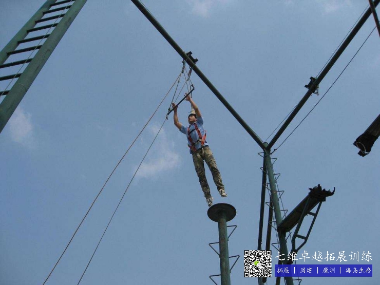 虽然身上有足够的安全保护装备,伙伴们也在积极的给我加油,面对这个拓展项目,我们或多或少都会产生恐惧感,对哪些有点恐高的人来说,顺着柱子向上爬的感觉是很漫长的,从柱子上站到柱子顶端的圆盘也是极大的考验,主要是铁盘的面积不大,站起来很不容易,往下看的话会感到眩晕,站立的过程中铁杆一直在晃动也许只是我的心理作用,跃起抓杠更是心理挑战,作为身体不差的我都不确保能否抓住单杠,更不用说哪些相对瘦弱的女同伴了。一瞬间的恐惧、紧张、怀疑等各种情绪混合在一起,大脑一片空白,忽然听到一位伙伴喊了一句“加油啊,兄弟”更多的伙伴发出更多的鼓励声,那一瞬间,觉得心里暖洋洋的,身体里忽然间充满了力量一般,双腿用力向上跃起,我抓住了单杆,这是我才发现它比我想象的要近,一开始那种遥远的感觉消失了,悬在半空的时候,我的内心是踏实的,我知道有我的同伴在支持着我,陪伴着我,激励着我。
