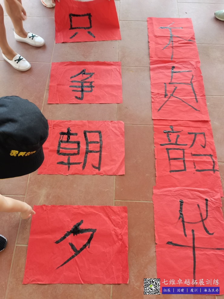 在地上放一张一平米大的纸。每个人拿一条线,拉着大毛笔在水写纸上困难但又坚定地写字。最终,大家齐心协力用笔书写下了“只争朝夕,不负韶华”几个大字。