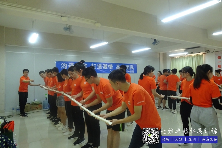 所有队员一字排开,手持接力棒,在保证圆珠不掉落的情况下从教练指定的位置运珠到达终点。要有良好的工作心态和勇于接受挑战的精神才能顺利完成。充分体现团队的领导力,沟通协调能力,工作的计划与严谨性时间与效率的控制,资源的有效利用,及具备在规定时间内调动各种资源解决问题的能力。