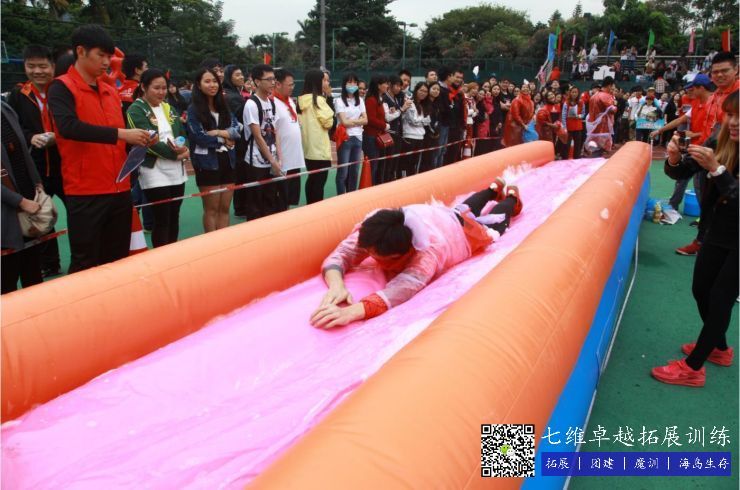 【比赛方法】:滑道上有泡沫,参赛人员穿着一次性雨衣从起点用尽全力进行滑行,本项目为接力赛,最终成绩以各队所有队员滑行距离总和为准。
