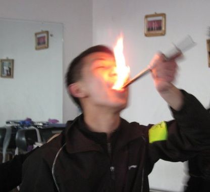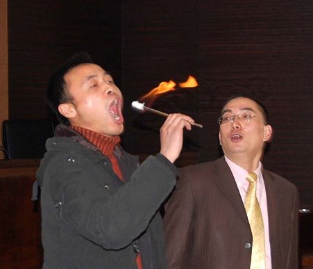 客户感言:一根棉棒蘸上酒精,再火点燃,把几寸高的火焰往嘴里吞下。吞火训练能有效锻炼人的自我突破能力和培养积极的信念:“吞火你都可以,那么还有什么不敢做!”