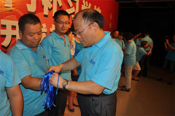 现在请我们所有的伙伴互相走动走来,把你握在手中的蓝丝带献给你的朋友,你的同事,你的领导,伴随着这首歌—把爱传出去