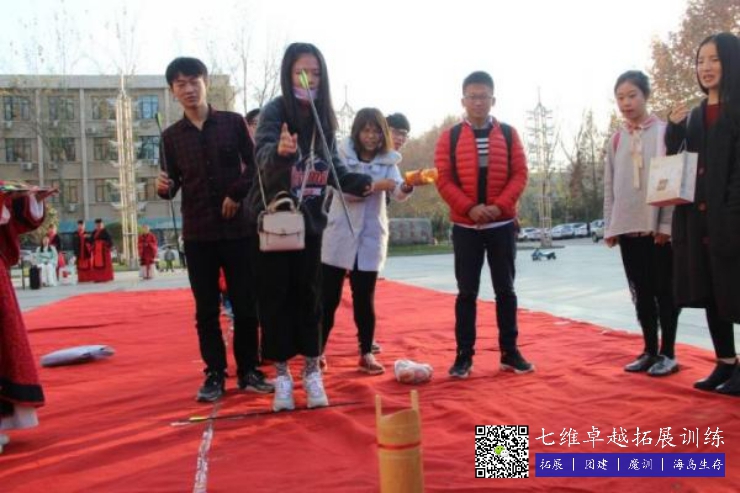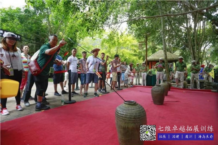 这是一个古代贵族运动,非常的高雅,等一下每组指派3-5位伙伴参加挑战,每个组发放8只箭,进行投壶比赛。你们的任务是:把箭尽可能的投进前面的箭筒中。