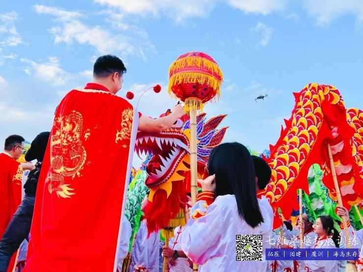 组装龙,穿上龙服、披风,拿上战旗,擂响战鼓。团队各就各位。