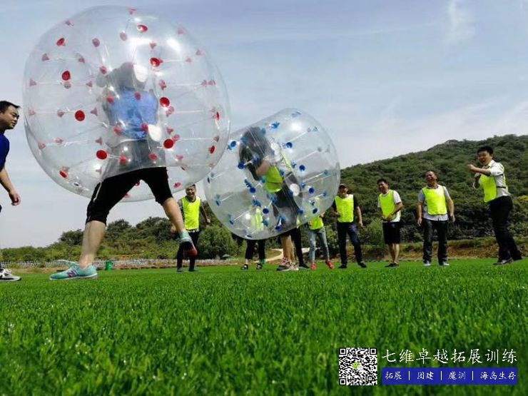 游戏规则:每队选出一名代表,穿上碰碰球后,选手们抓紧球内壁的把手,在限定的区域内进行碰撞,出界的选手视为失败。