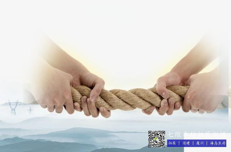 项目规则:参训团队以拉取绳索的方式,中心点设置一个区域,参训团队同时向外移动,最先进入中心区域的团队淘汰。